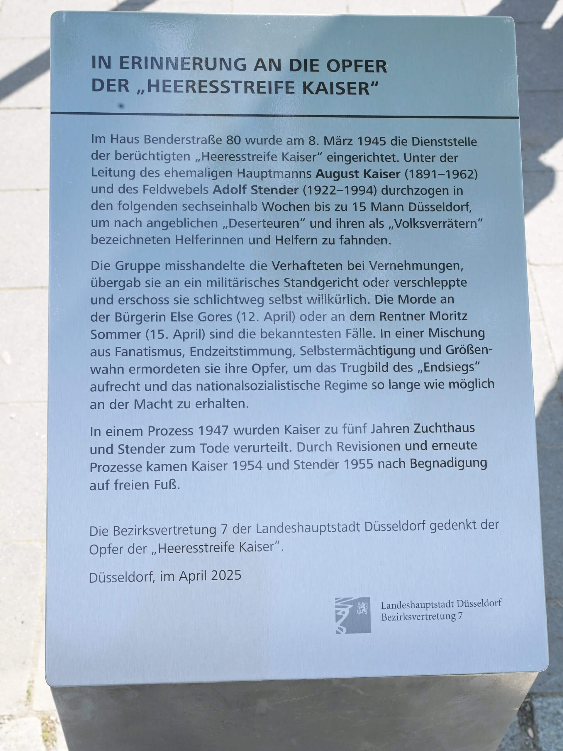Die Installation der Informationsstele fand im Rahmen des Programms der Gedenkveranstaltungsreihe „Düsseldorf erinnert – 80 Jahre Befreiung und Kriegsende“ statt.
